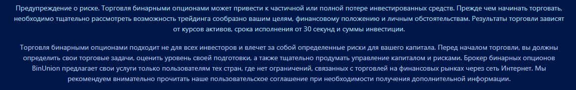 Мошеннический контора BinUnion Net на своем сайте, мелким шрифтом предупреждает всех клиентов, что работая с ними, можно либо слиться, либо просто не получить никакого вывода. Но не каждый увидит это мелкое предупреждение и как показывает практика, такое случается с конторой в 100 процентах случаев.