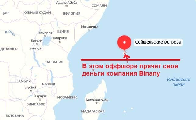 Мошенническая инвестиционная компания Binany Com зарегистрирована в оффшорном островном государстве Сейшельские Острова в Индийском Океане в Южной Африке. Здесь аферисты хранят заработанные неправедным трудом деньги и укрываются от правосудия.