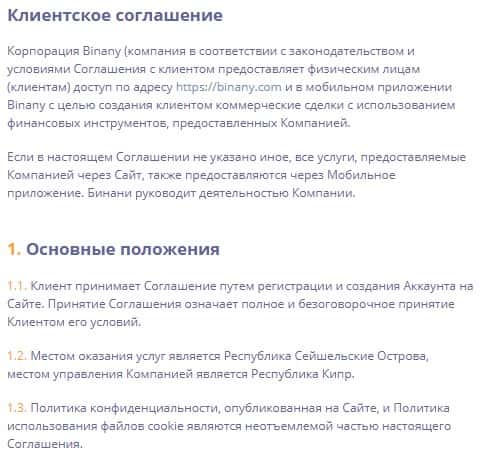 Клиентское соглашение инвестиционной компании Binany Com, опубликованное на ее официальном сайте