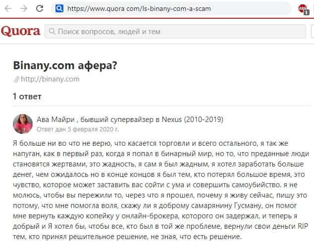 Трейдер в своем отзыве на информационном сайте quora com поведал о том, что потерял веру в порядочность и честность, когда впервые столкнулся с торговлей бинарными опционами, и только благодаря большим усилиям неравнодушных людей удалось возвратить свои деньги из рук жуликов Binany Com.