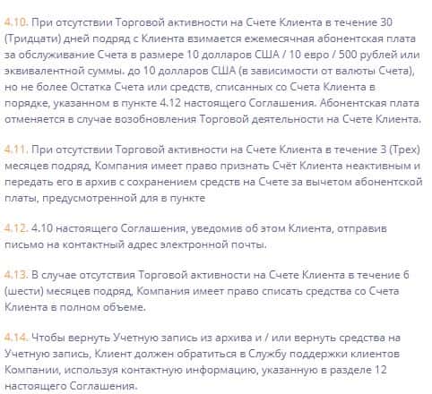 Согласно клиентскому соглашению компания Binany устанавливает ежемесячную абонентскую плату с клиента за обслуживание счета в случае отсутствия его торговой активности в течение 30 дней, а в случае отсутствия активности до трёх, или даже шести месяцев, имеет право признать счет клиента неактивным или вовсе списать в полном объеме все средства пользователя.