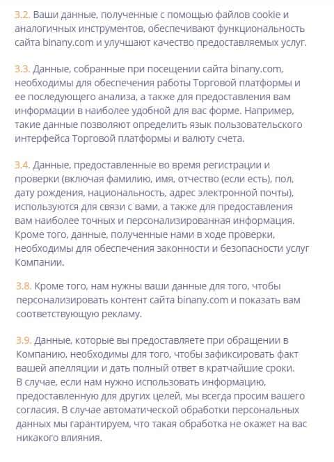 Администрация брокерской инвестиционной компании по торговле бинарными опционами Binany не ограничивает себя в использовании персональных данных своих клиентов для обеспечения деятельности собственной торговой платформы, а также в рекламных и информационных целях.