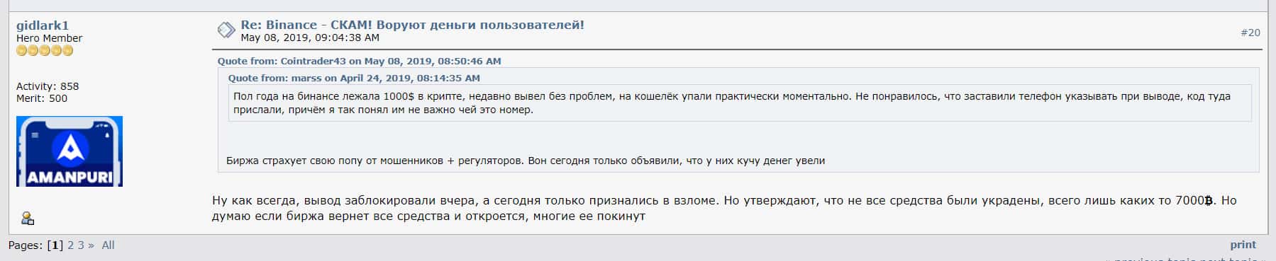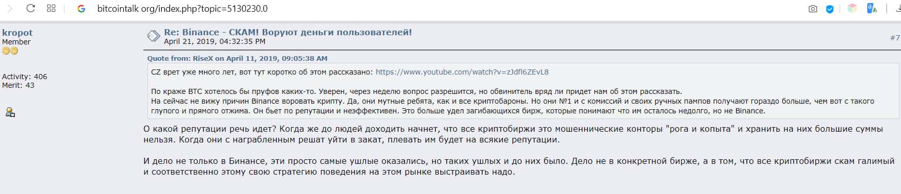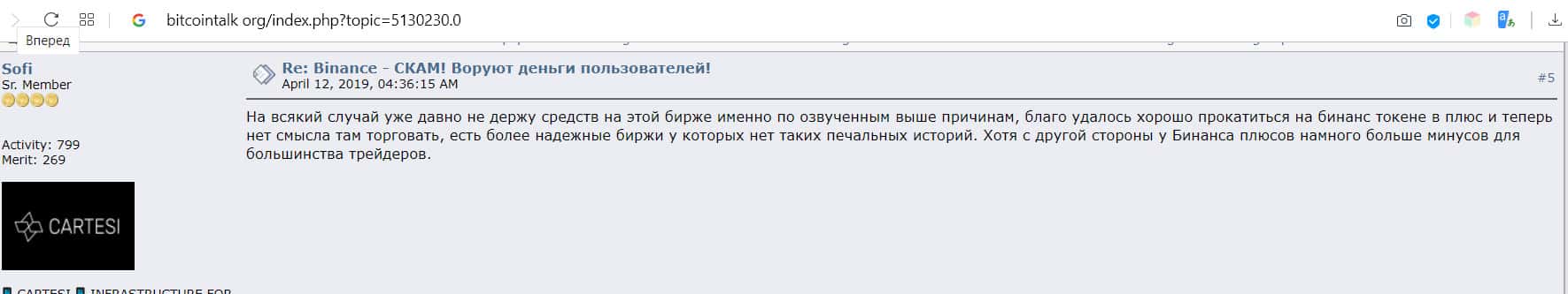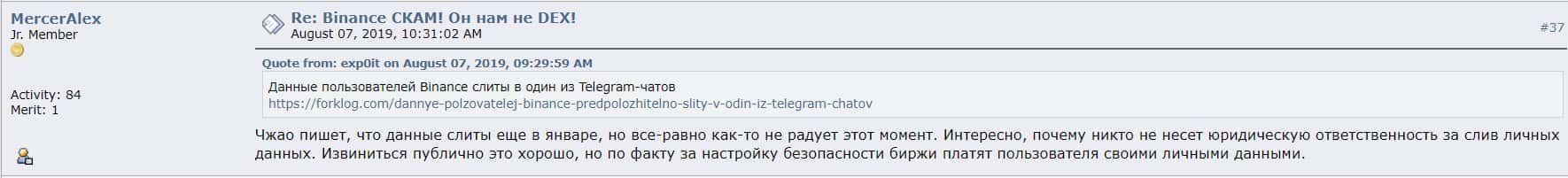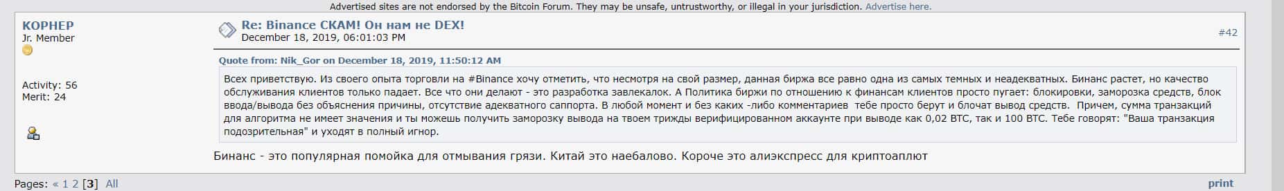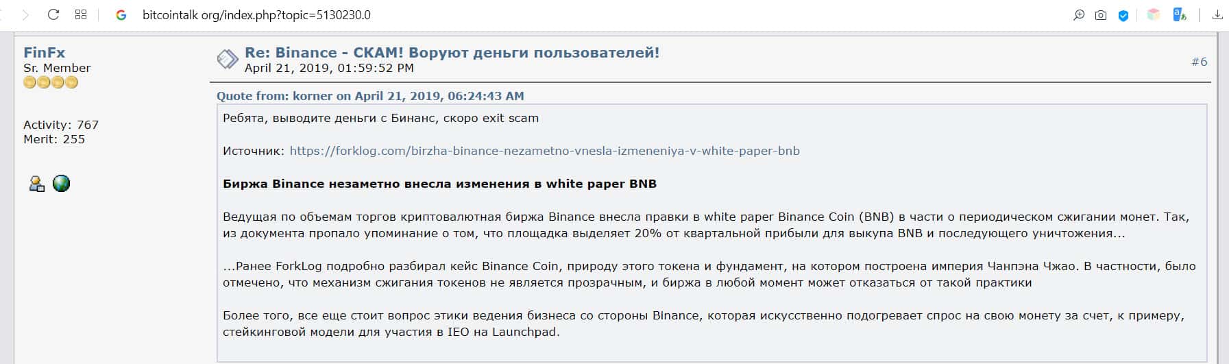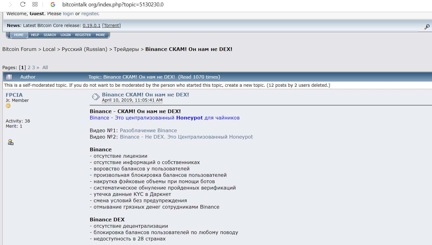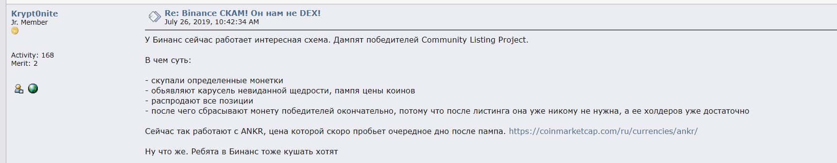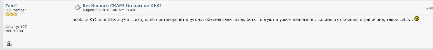 - Комментарий пользователя на форуме bitcointalk org о том, что проект Бинанс ДЕКС является скамом