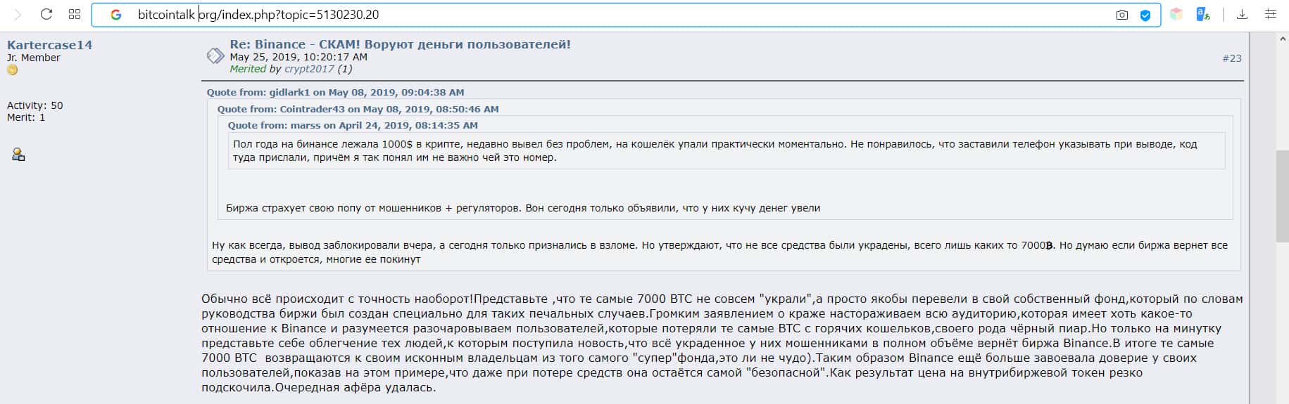 Участники обсуждения нечестных делишек фирмы Бинанс ДЕКС пишут на форуме Биткоинток, что людям начали блокировать аккаунты. После чего руководство площадки заявило, что их взломали у похитили 7000 биткоинов. Правда это или нет, но торговать на этой жульнической бирже небезопасно.