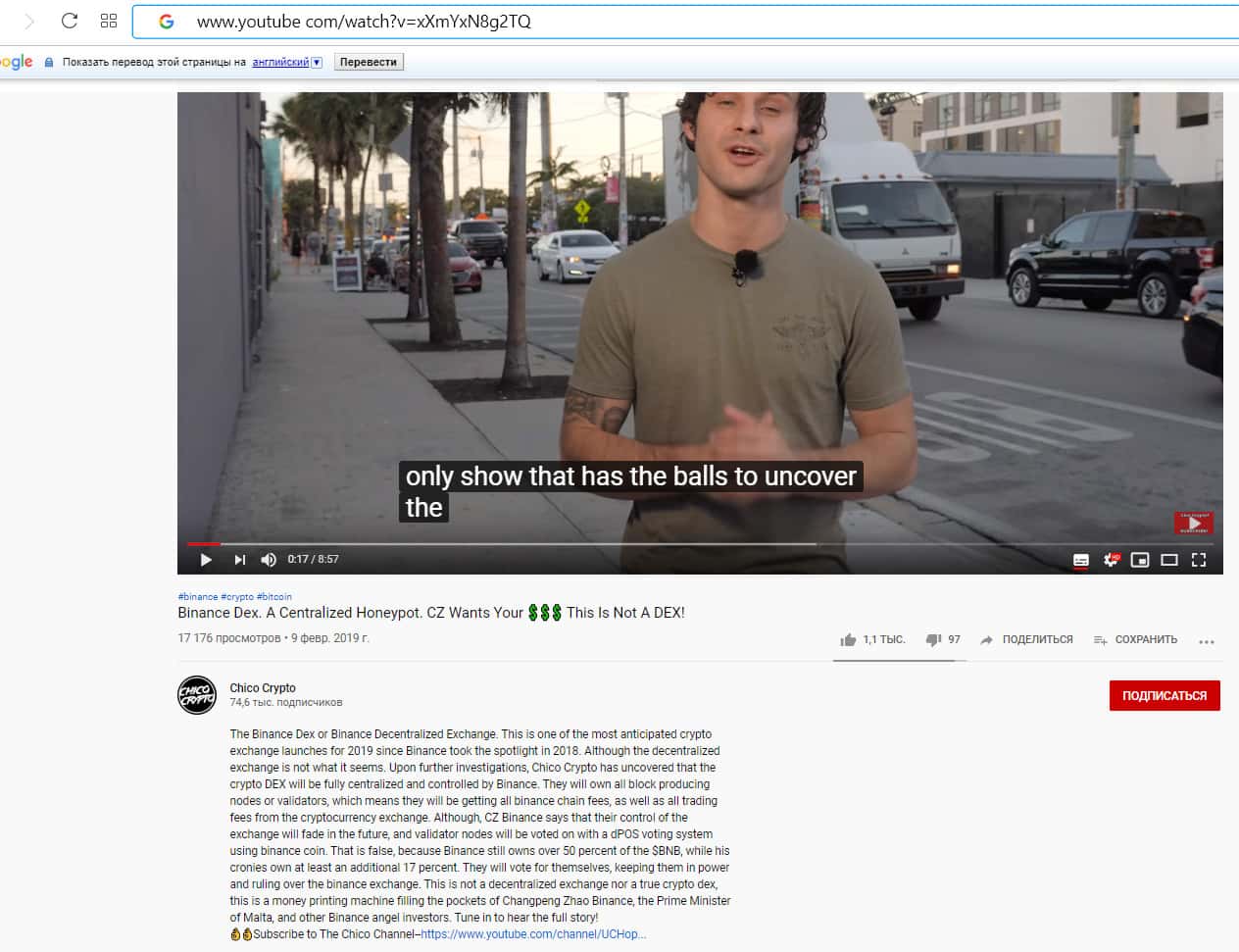 Американский блоггер выпустил видеоролик, разоблачающий организаторов криптобиржи Binance DEX. В нем говорится о том, что данный проект будет полностью управляться создателями Бинанс, и на самом деле будет полностью централизован. Разговоры о децентрализации - полный обман.