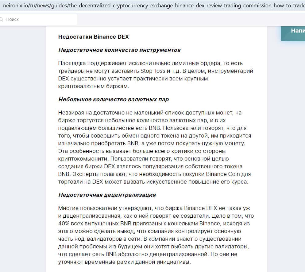 - Ресурс neironix io опубликовал список недостатков компании Бинанс ДЕКС