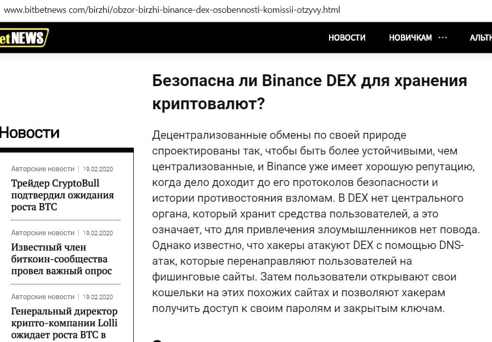 На сайте bitbetnews com появилась статья о компании Binance DEX, где затронули вопрос о том, безопасно ли хранить средства в подобных сервисах. Авторы пишут, что хакеры часто атакуют DEX биржи с помощью DNS-атак, когда клиент перенаправляется на другой сайт, и сам отдает доступ к кошельку грабителям.