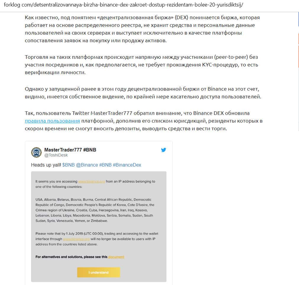 В статье на сайте forklog com приводятся доказательства того, что создатели проекта Бинанс ДЕКС обманывают клиентов, вешая им лапшу на уши. Авторы запостили скрин, где видно, что биржа ограничила число стран, которые могут с ней работать. Этот факт уже вовсю обсуждается на иностранных форумах.