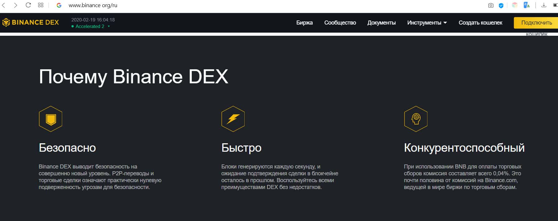 Сайт компании Binance DEX визуально выглядит довольно современно и креативно, что отличает его от других лохотронов. Однако, от вранья никуда не деться. Те же заявления о безопасности и успешности торговли и хранения средств, как и везде. О надежности торговли криптовалютой не может быть и речи, так как это самый опасный инструмент.
