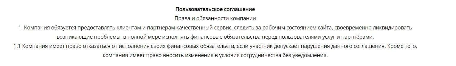 В разделе Пользовательское соглашение компания Binary Cash пишет, что может изменять условия настоящего договора по своему желанию.