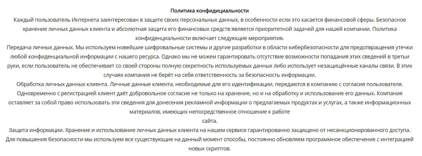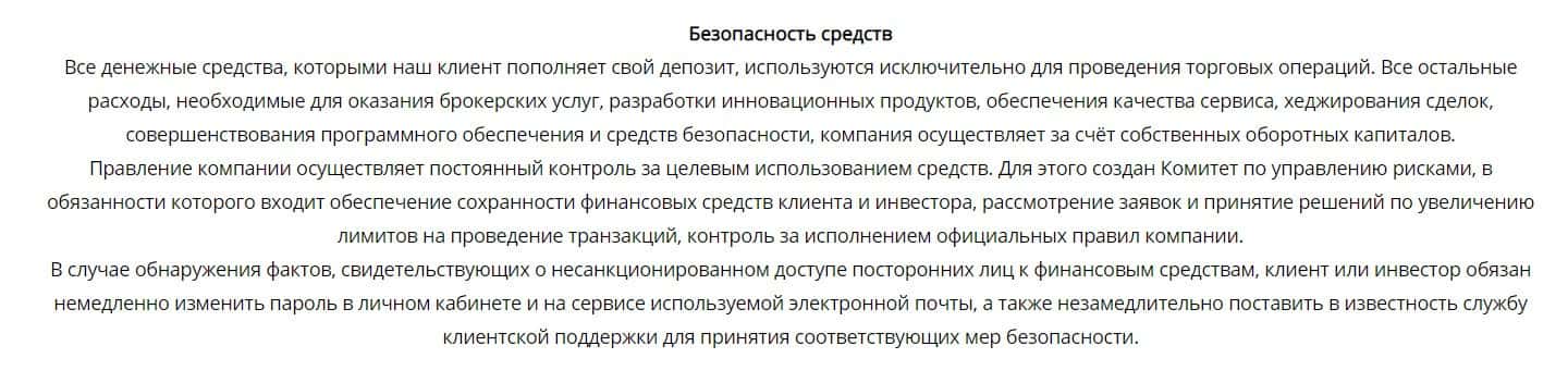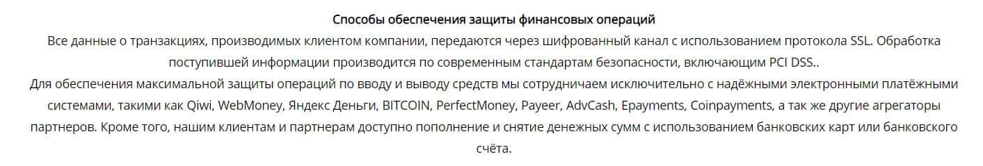Далее идет раздел о том, что контора якобы обеспечивает надежность хранения средств клиента, для чего применяются специальные способы шифрования данных.