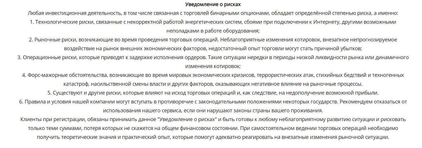 В последнем разделе своего договора контора Binary Cash предупреждает пользователей о высоких рисках, с которыми связана торговля на бирже.