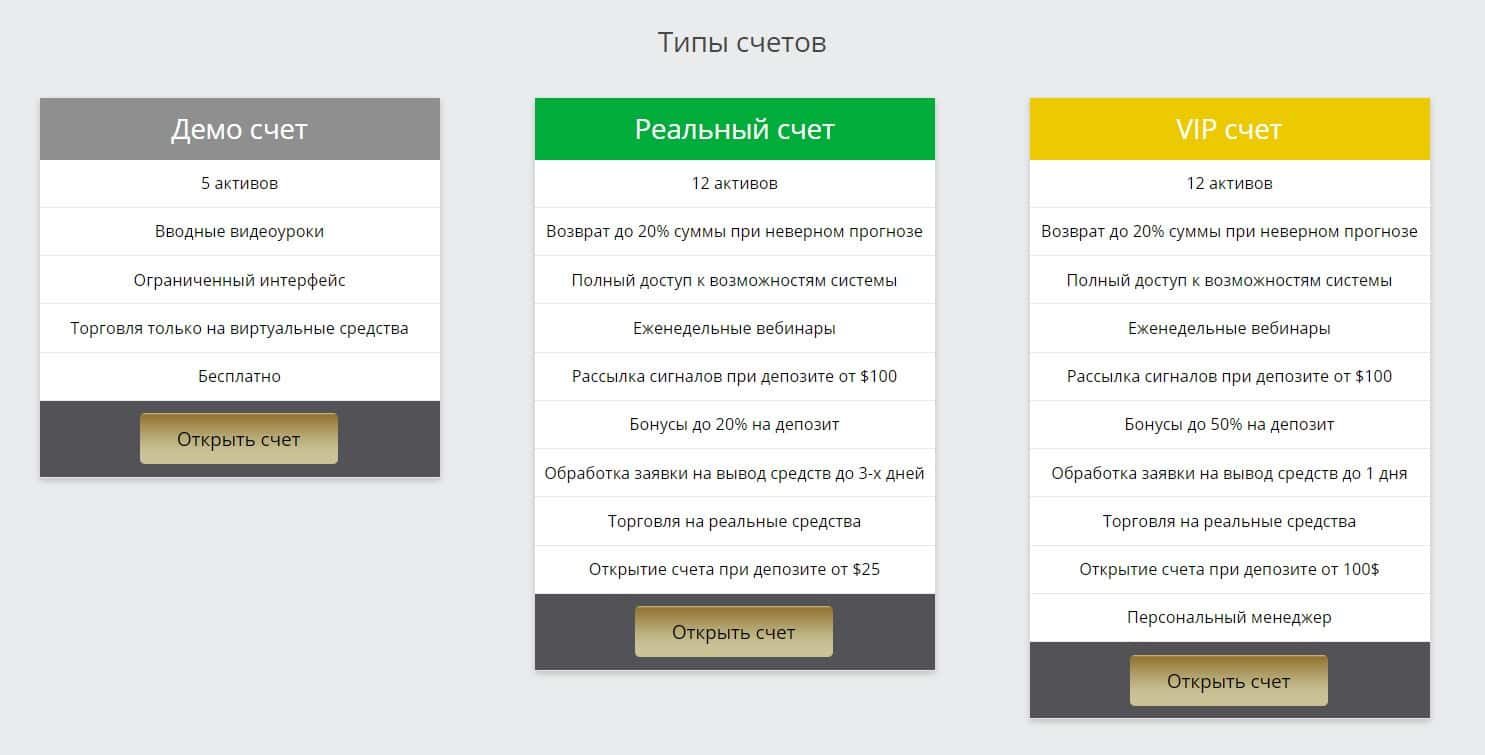 Типы счетов, выложенные на сайте лжеброкера Бинари Кэш, абсолютно фейковые, что понятно даже новичку, недавно начавшему заниматься трейдингом.
