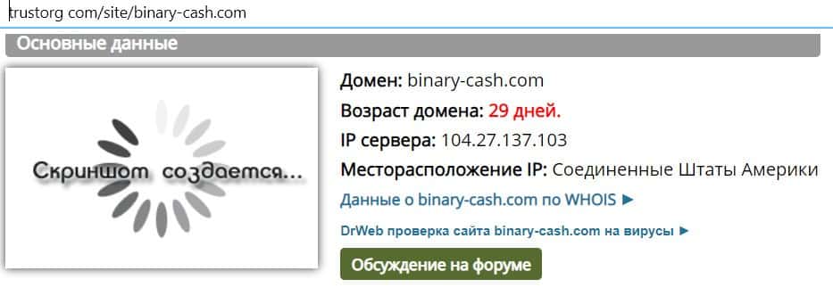 Возраст доменного имени сайта binary-cash com составляет 29 дней. Ни о какой солидной фирме с таким сроком работы сайта не может идти и речи.