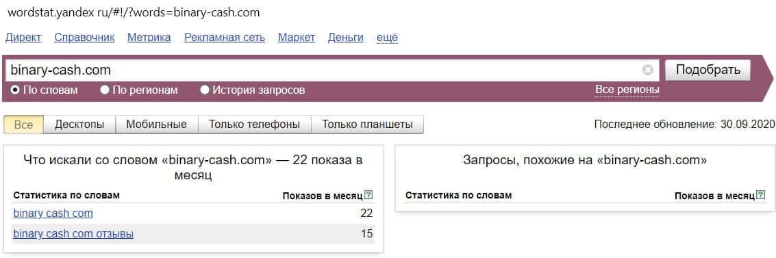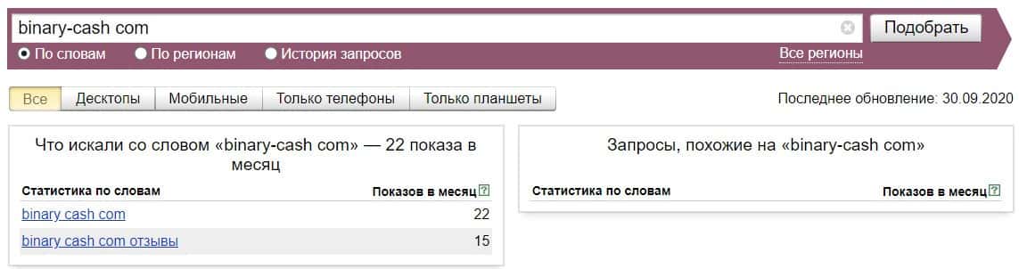 В поисковой системе Яндекс сайт брокерской конторы "binary-cash.com", вбитый в строку с точкой, пользователи искали всего 22 раза.