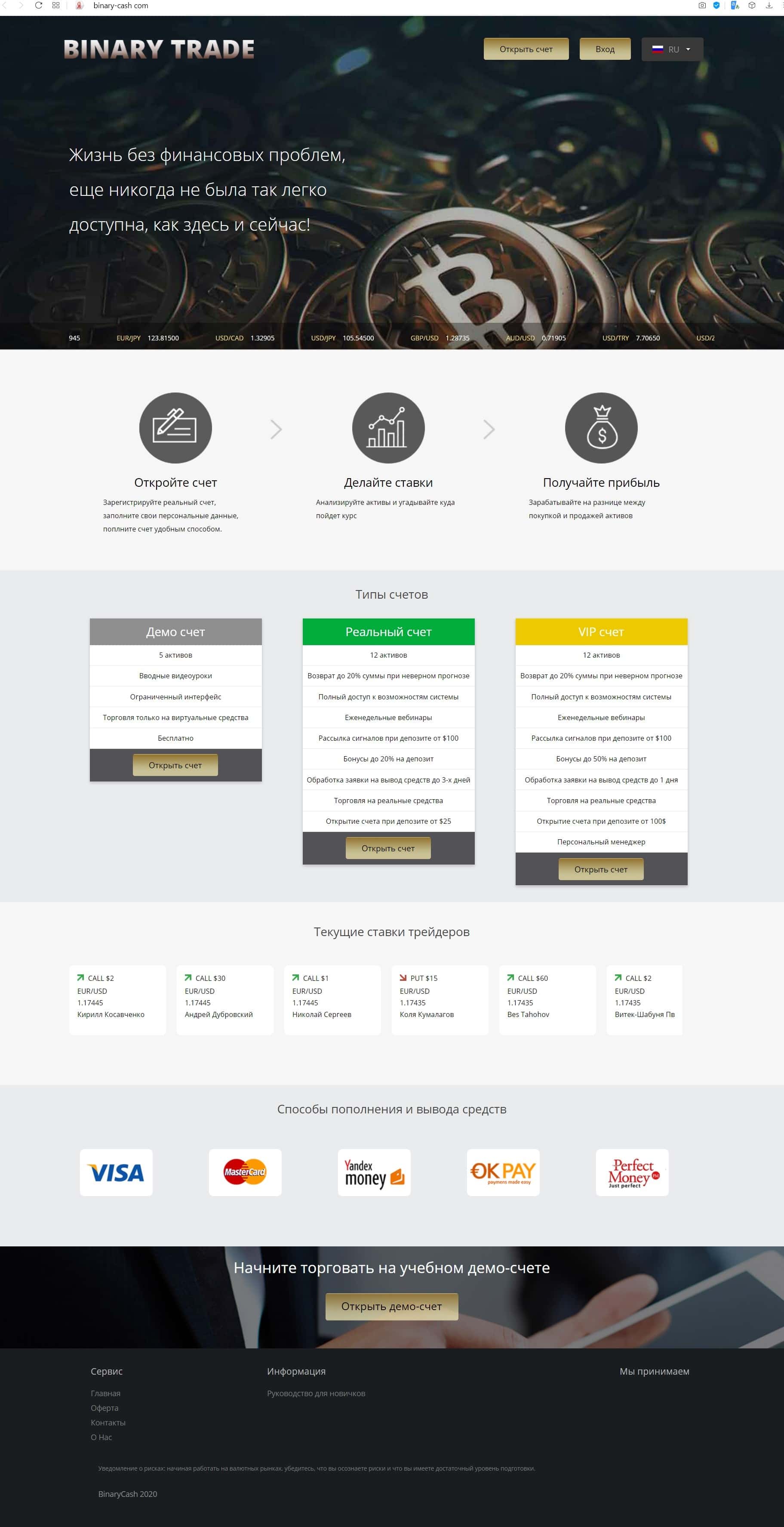 Как выглядит главная страница сайта псевдоброкера Бинари Кэш?