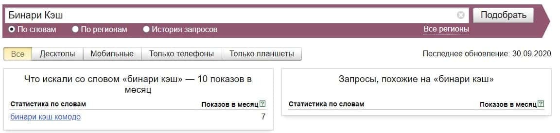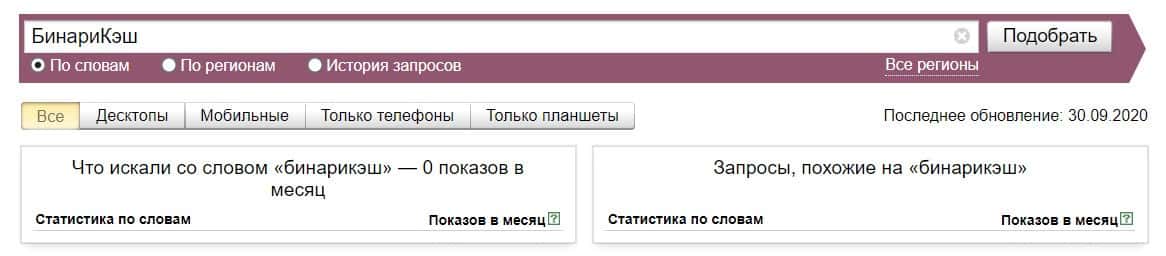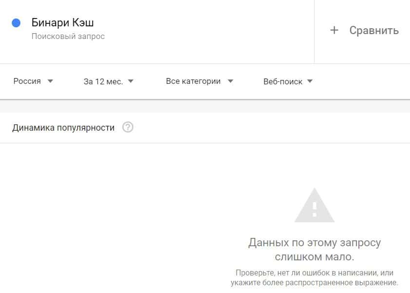 То же название на русском языке, но с пробелом "Бинари Кэш", пользователи также почти не искали в системе Гугл.