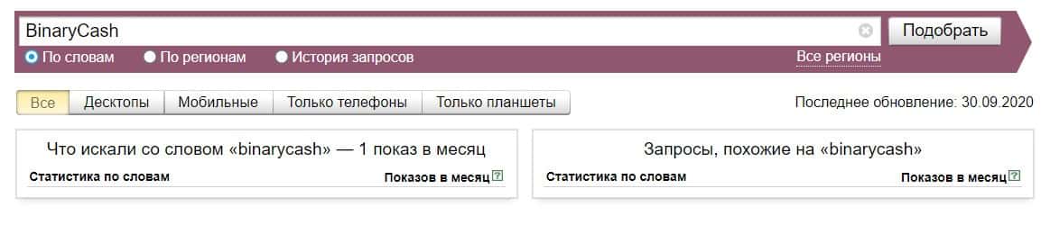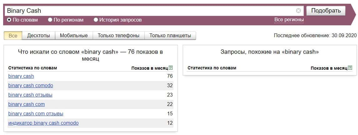 То же название "Binary Cash", но написанное с пробелом, люди пытались найти в системе Яндекс 76 раз.