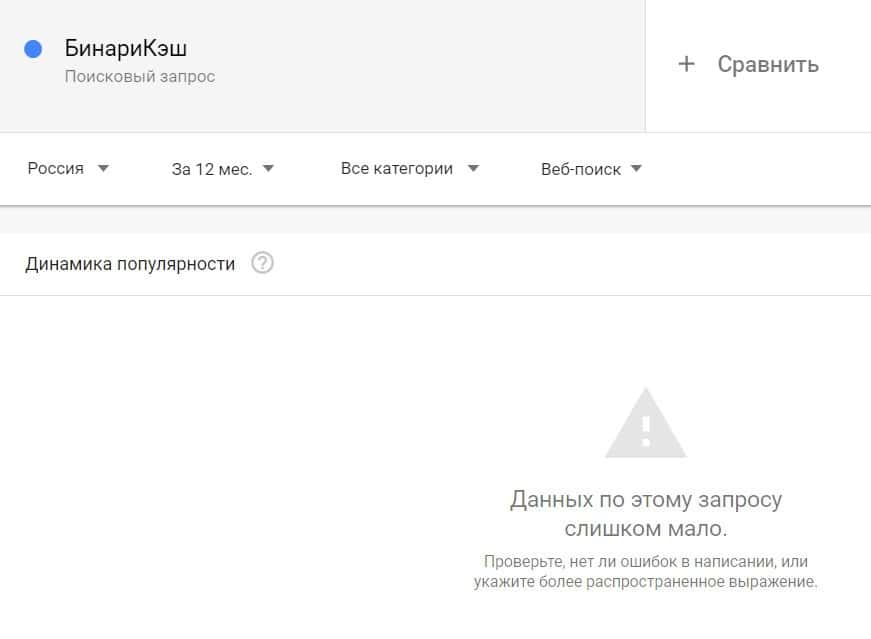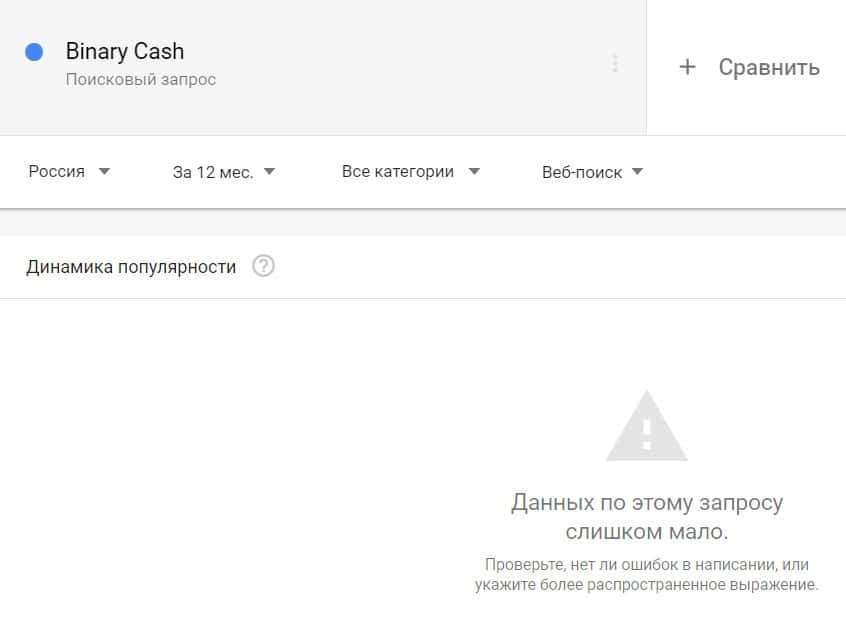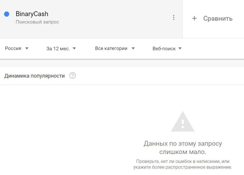 Посмотрим, насколько популярно название бренда "BinaryCash", написанное на английском языке. Данных по этому запросу нет, так как в Гугл не было большого количества запросов.