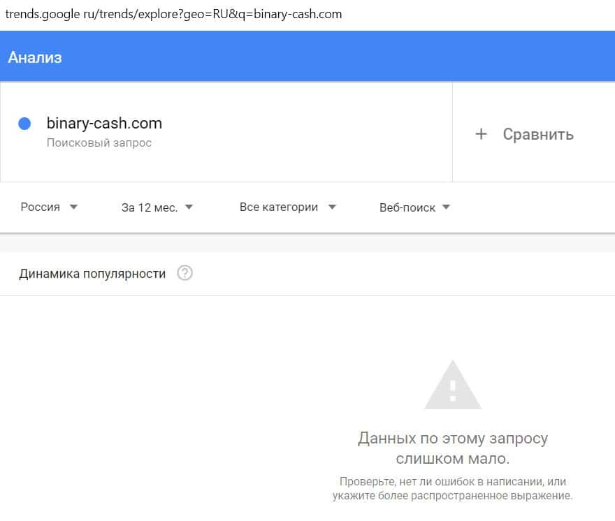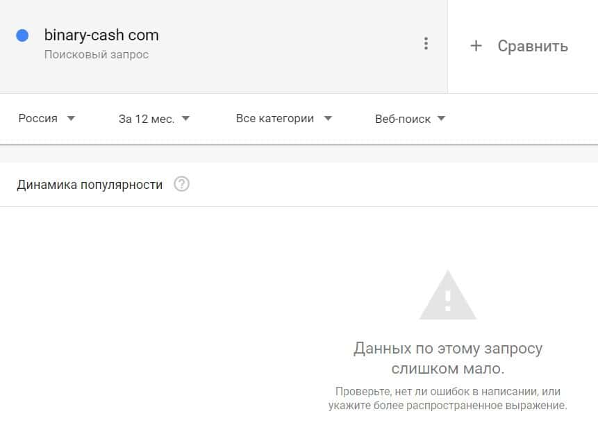Количество запросов по домену "binary-cash com", вбитого в поисковик Гугл без точки, столько же, то есть, очень мало.