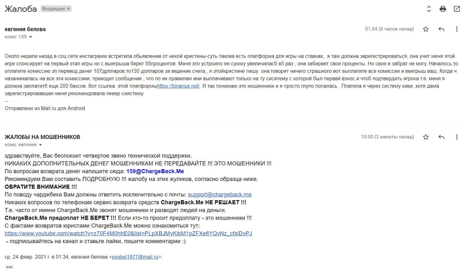 В данной жалобе в подробностях описывается схема развода со стороны лохотрона Бинариакс. Они выманили у жертвы определенную сумму денег и продолжают вымогать еще.
