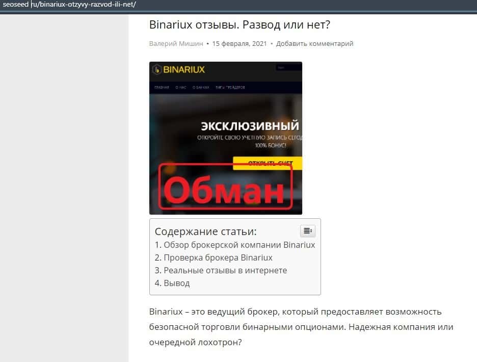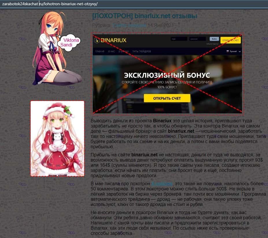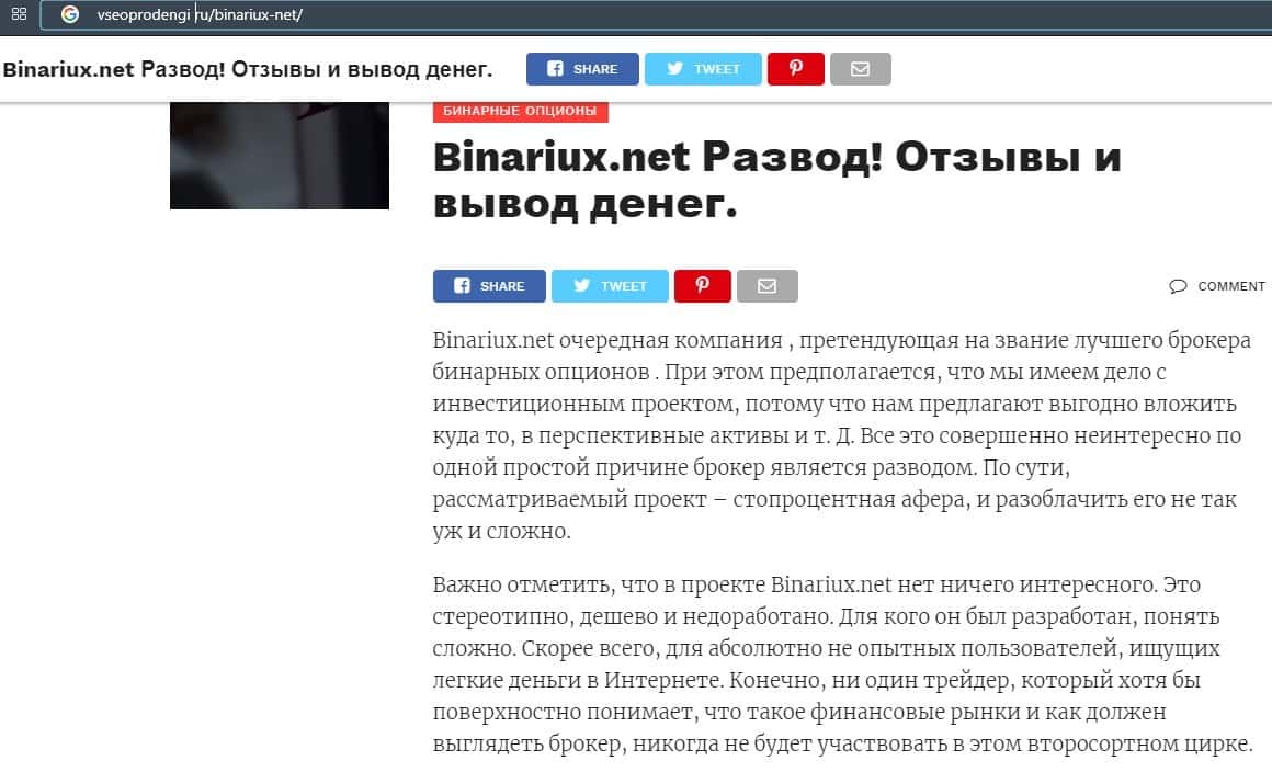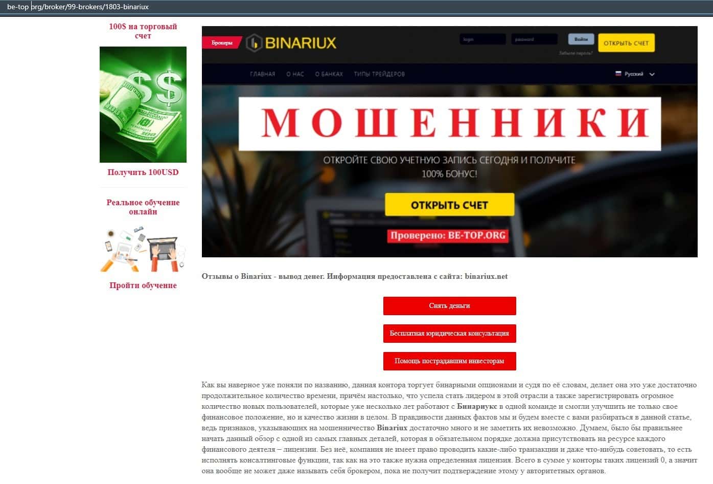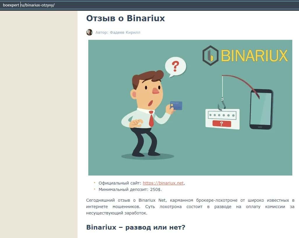 Еще в одной статье описывается, контора Binariux Net занимается мошенничеством и она подводит своих жертв к внесению денег. Это бинарная кухня по разводу наивной клиентуры.