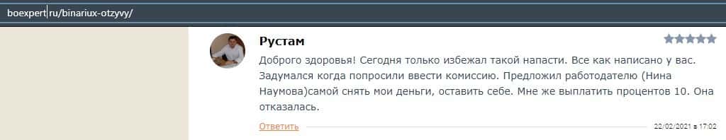В данном отзыве человек рассказал о схеме развода мошеннической конторы Binariux Net с помощью которой они пытались развести его на деньги. Он не повелся и указал имя разводилы: