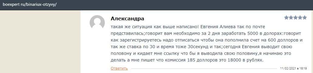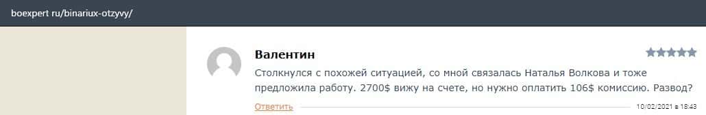 Еще одна девушка рассказала, что чтобы вывести деньги из лохотрона Binariux Net, ей предложили заплатить какую-то комиссию в размере 185 долларов, чего она не сделала.