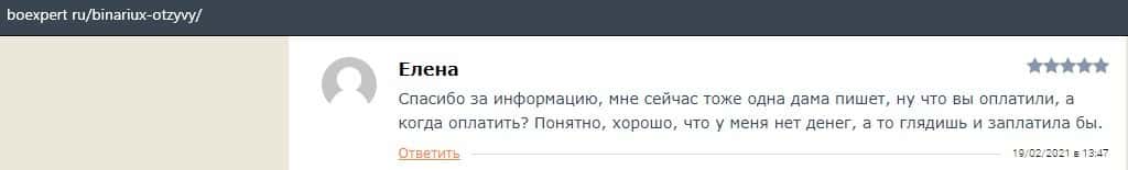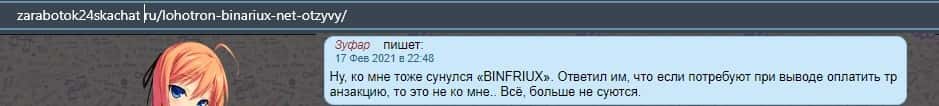 Женщина поделилась информацией о лохотроне Binariux Net, так как там ей предложили заплатить определенную сумму, дабы можно было вывести якобы вывод заработанные деньги.