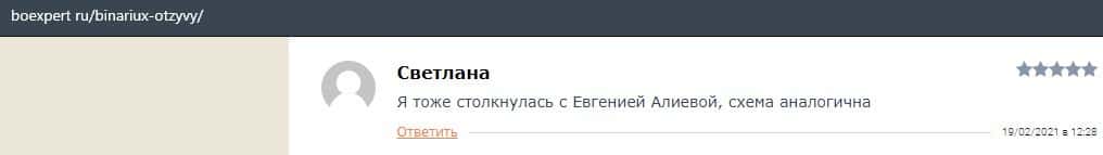 Далее представлена информация о шаражной организации Binariux Net. Девушка в своем отзыве описала, что ее разводила некая Евгения Алиева, которая разводила по той же схеме.