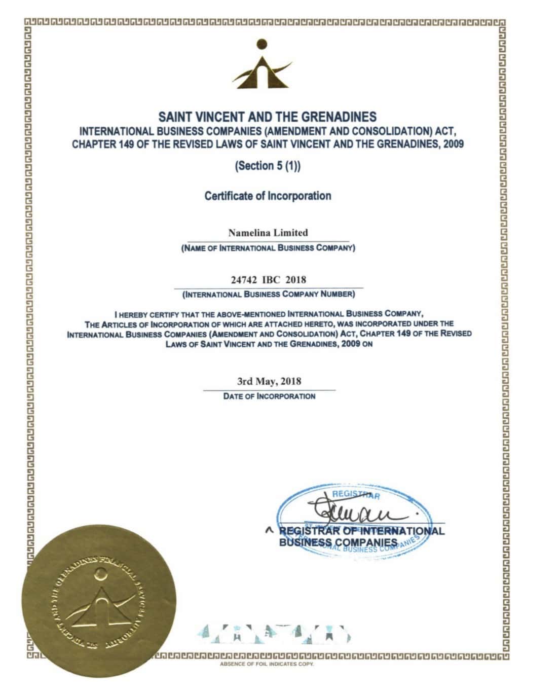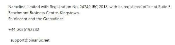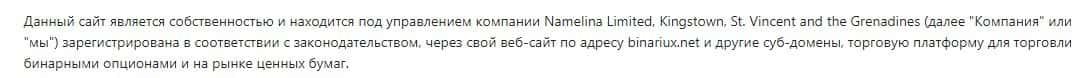 Далее представлены данные о Бинариакс, а конкретней компании, которая им владеет. Ею выступила некая Namelina Limited зарегистрирована на островах Сент-Винсент и Гренадины.