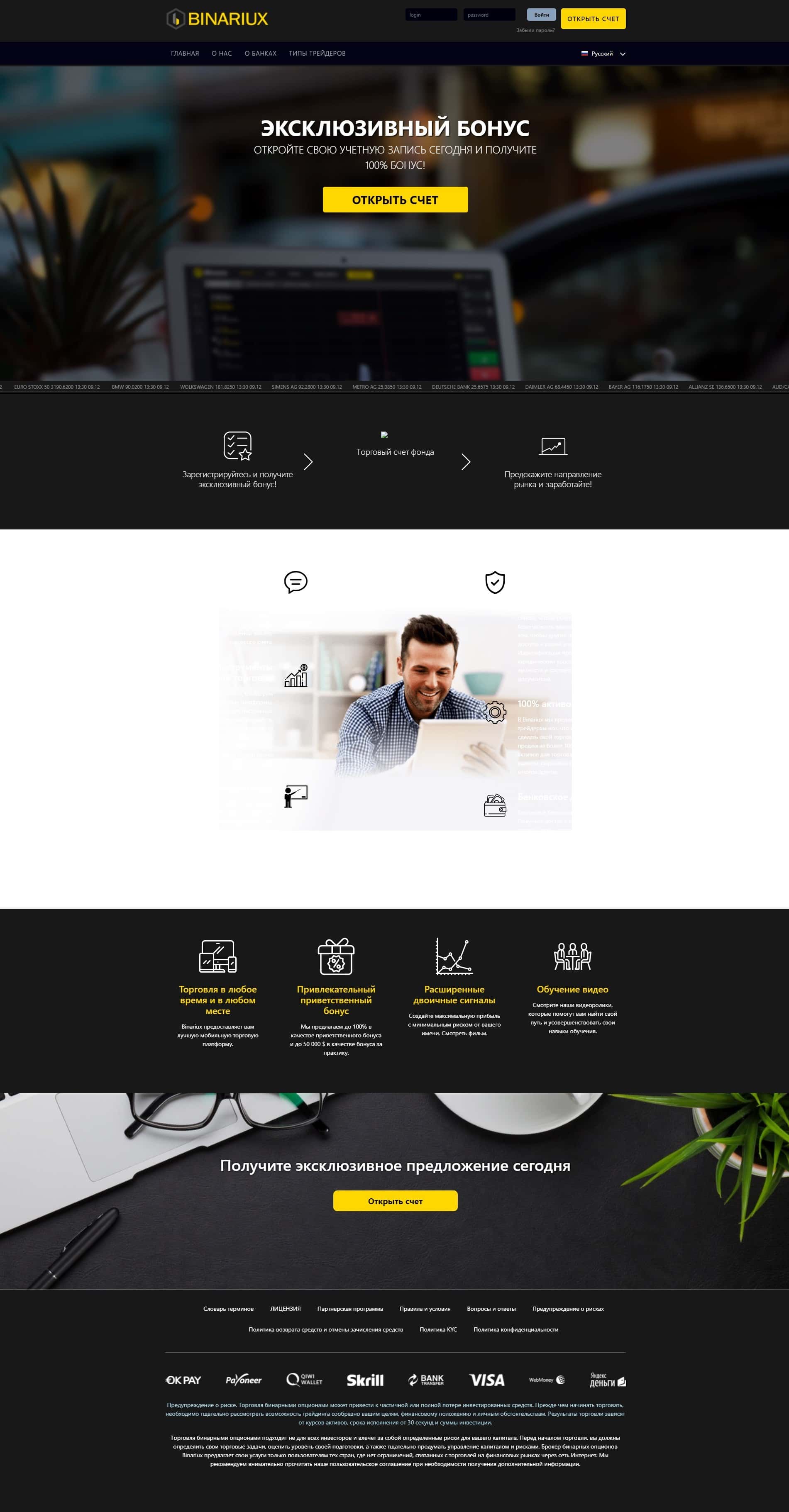 Ниже вы можете ознакомиться с официальным сайтом бинарной конторы Бинариакс, а вернее с ее главной страницей. С помощью нее аферисты заманивают к себе наивных жертв.