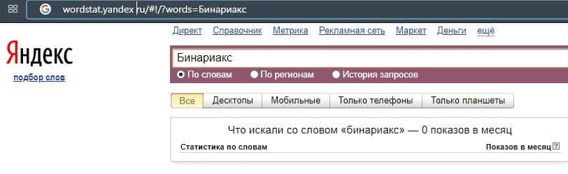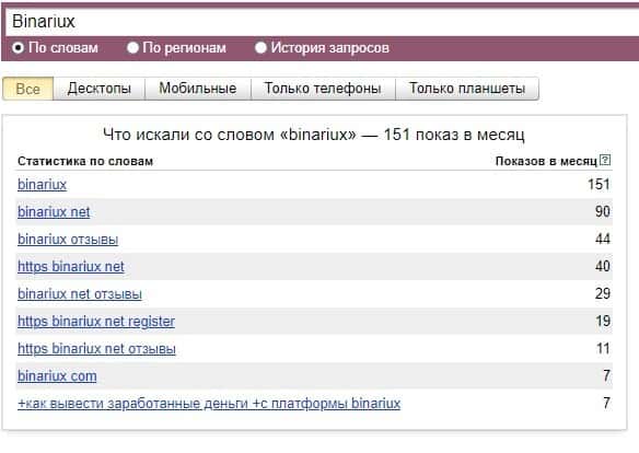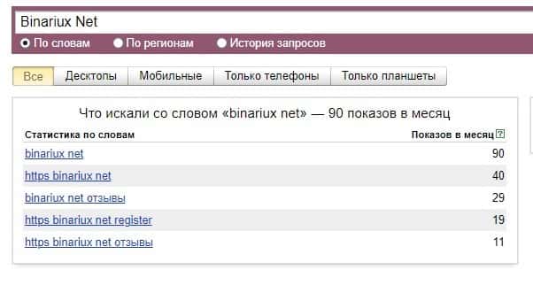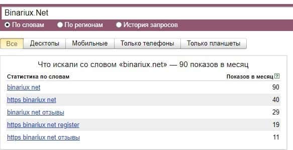 Если ввести в проверку официального сайта конторы "Binariux.Net", то система выдает такие же показатели за последний месяц по версии Яндекс Вордстат.