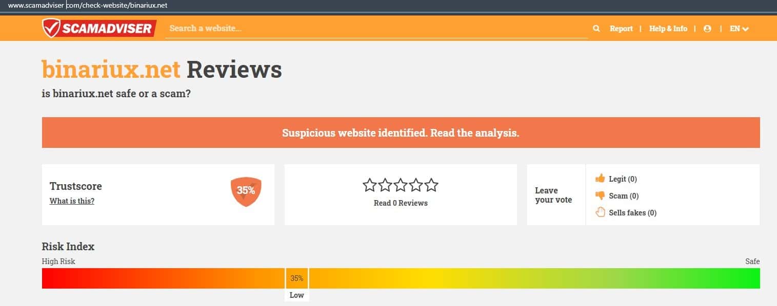 Ниже представлена информация с сайта scamadviser com касательно интернет-портала Бинариакс. Степень доверия к ним довольно низкая и составляет не более 35 процентов.