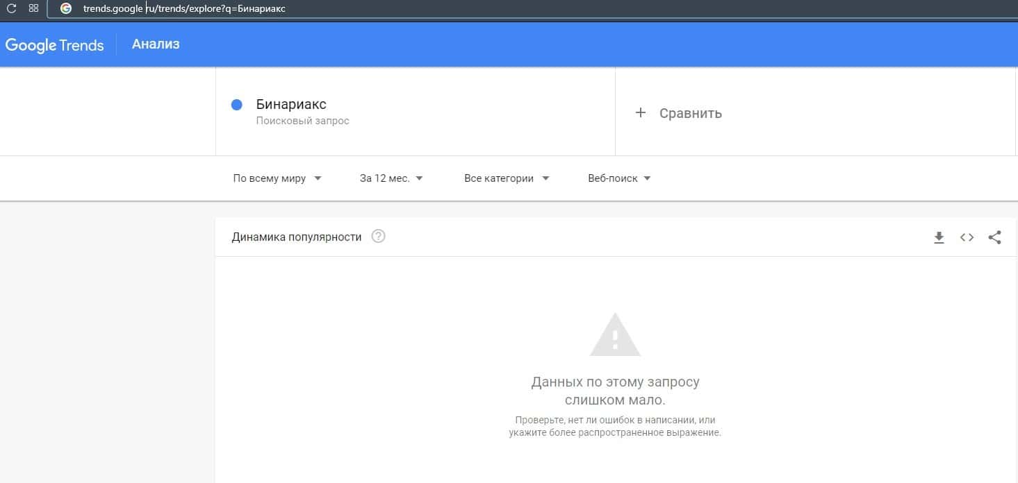 В поисковой системе Гугл, бинарные мошенники под брендом "Бинариакс" непопулярны вообще и набрали 0 запросов за месяц.