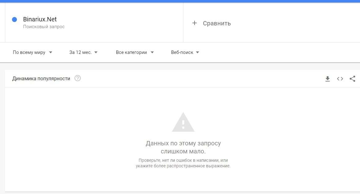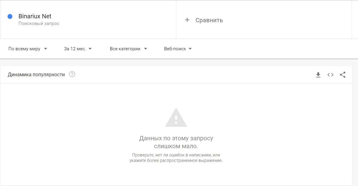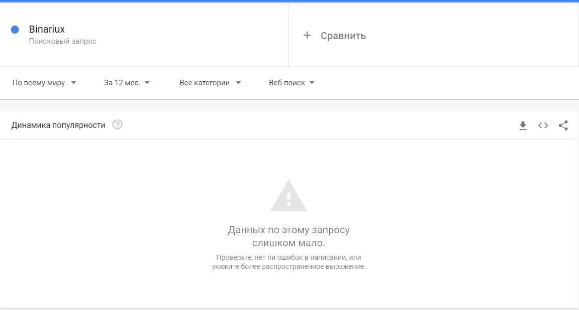 Ну и те же самые показатели, если ввести бренд официального сайта лохотрона "Binariux.Net". Мошенники по такому запросу не популярны в поисковой системе Гугл.