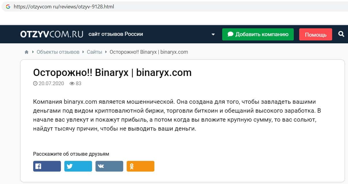 Несмотря на то, что о компании Binaryx мало информации в сети, мы нашли сайт otzyvcom ru, который указал, что данная организация является мошеннической и разводит клиентов.