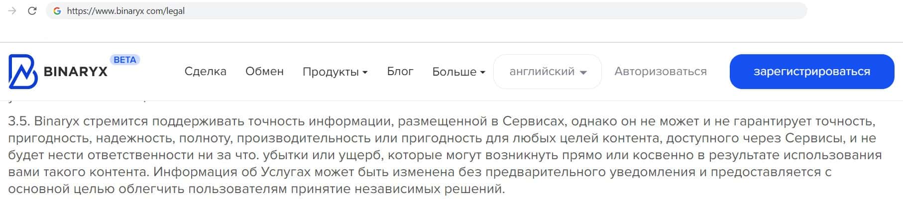 Фирма махинаторов Binaryx так же указала, что стремится поддерживать точность информации, которую предоставляет, но так же не отвечает за её достоверность.
