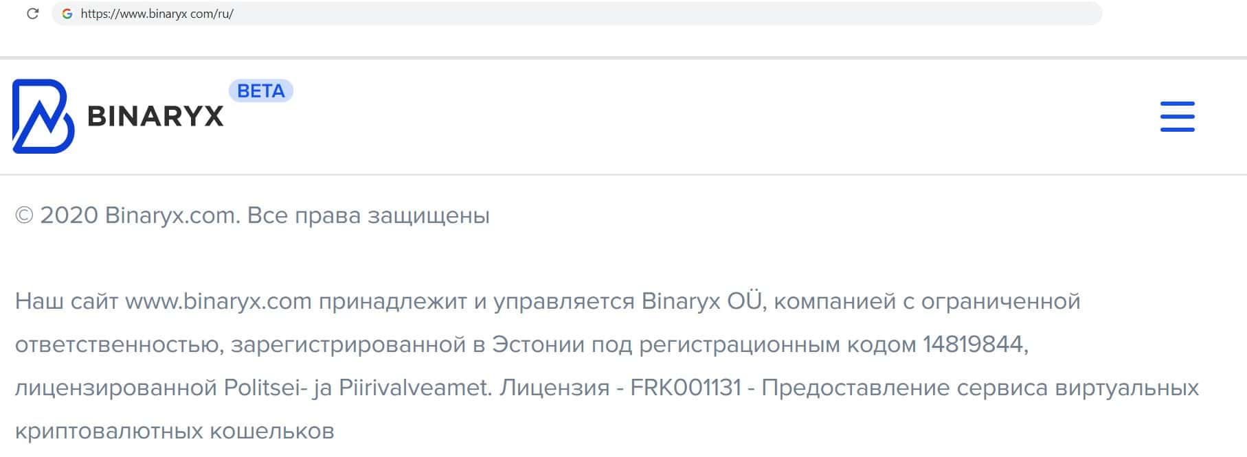 Фирма кидал Binaryx указала на своём сайте, что имеет лицензию, но кроме этих слов никакого подтверждения лицензии нет, что заставляет усомнится в данной информации.