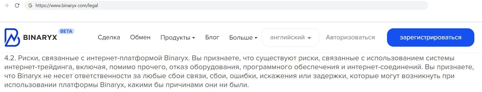 Так же компания Binaryx указала, что на её платформе могут быть сбои и другие проблемы с оборудованием, и интернет соединением, но фирма за это не несёт ответственности.