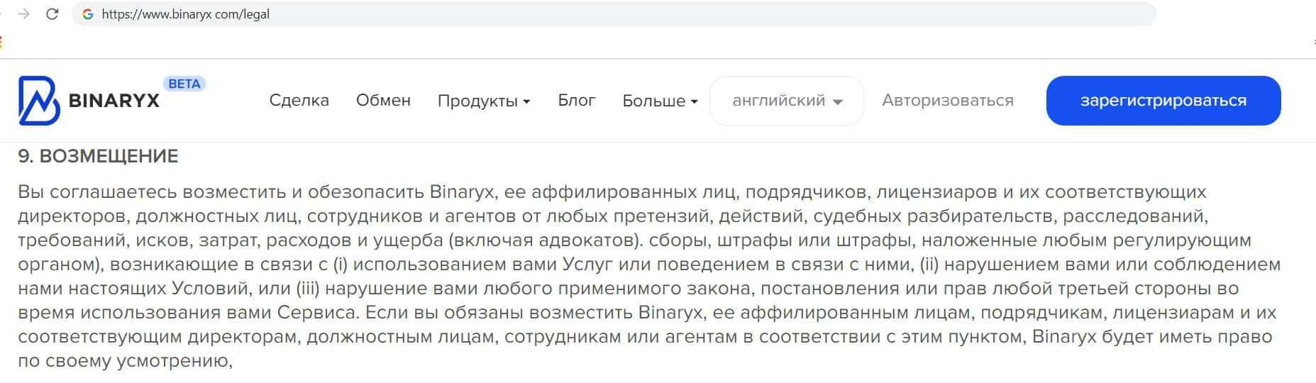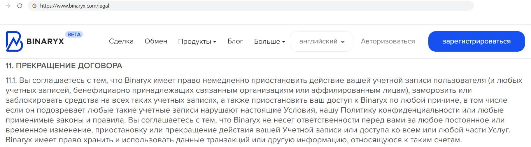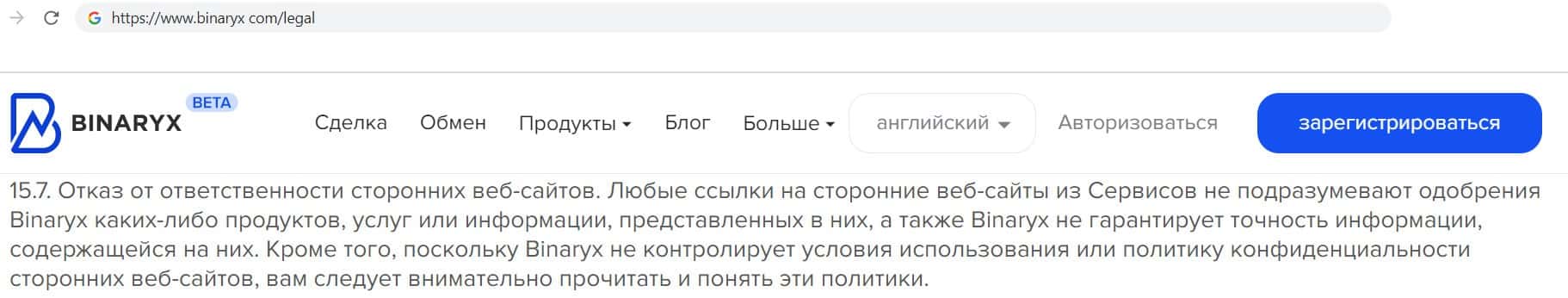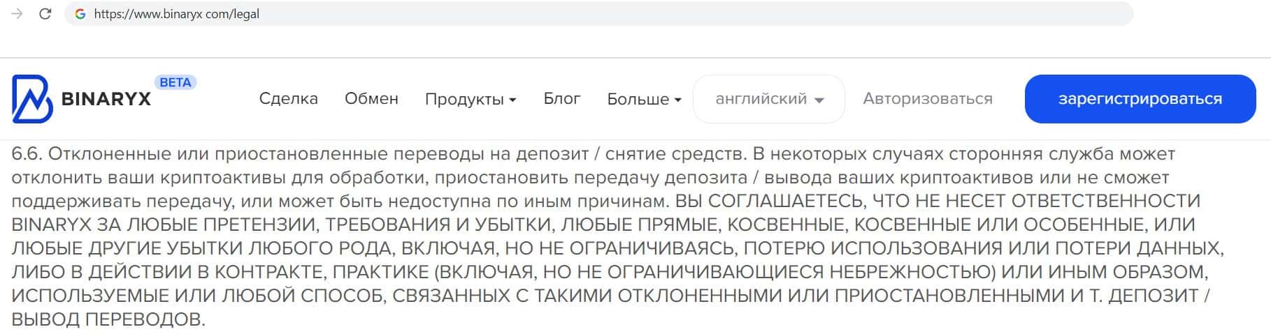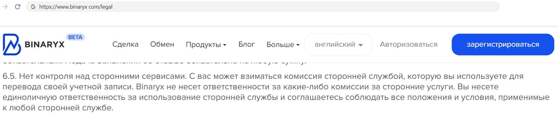 Кидалы Binaryx указали, что сторонние службы могут приостановить вывод или внесение средств, но при этом сама компания не отвечает за действия этих служб.