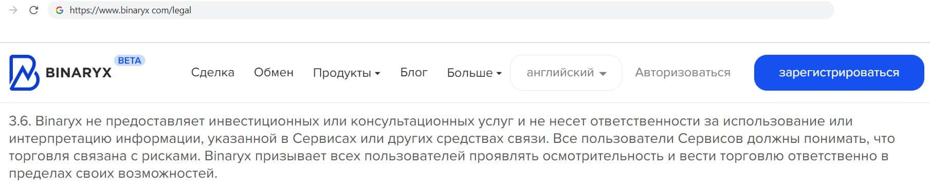 Фирма финансовых жуликов Binaryx указала, что не предоставляет никаких консультаций и не даёт советов, а клиенты компании используют предоставленную информацию на свой риск.