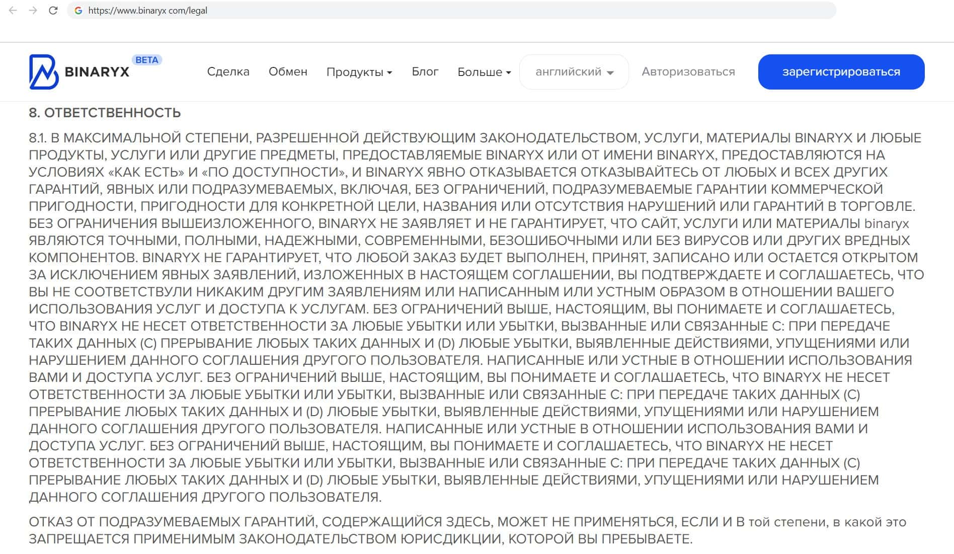 Фирма махинаторов Бинарикс представила пользователям пункт о ответственности, но читая его становится понятно, что по сути фирма кидал не несёт никакой ответственности.