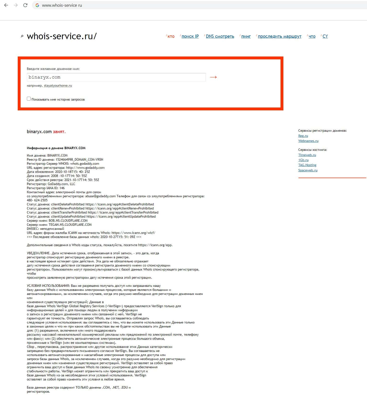 Кому принадлежит домен компании финансовых кидал Бинарикс?
