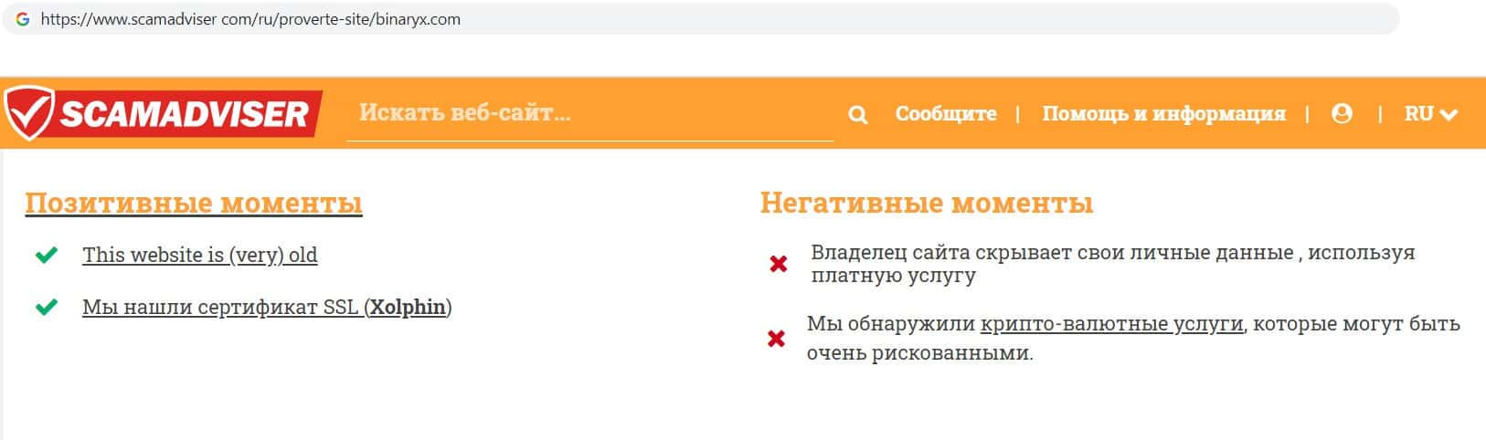 - Мнение интернет ресурса scamadviser com о недоконторе Binaryx