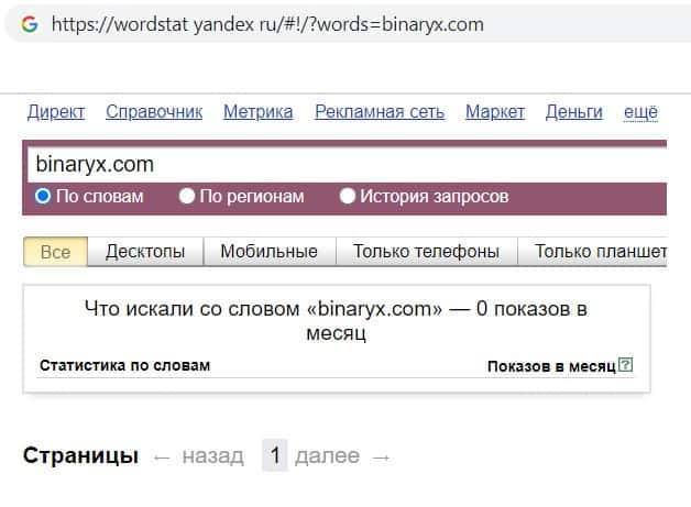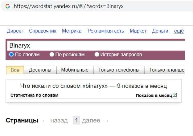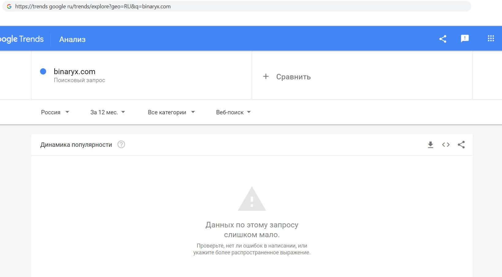 Так же мы решили проверить количество запросов конторы махинаторов Binaryx по русскоязычному названию компании, а именно "Бинарикс". Но результат оказался нулевой.