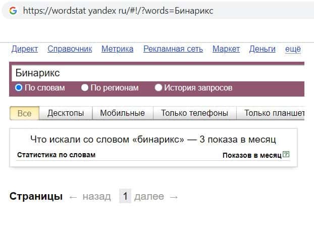 Так же мы проверили количество запросов компании финансовых разводил Binaryx по русскоязычному названию, а именно "Бинарикс". 3 раза пользователи совершили запрос.