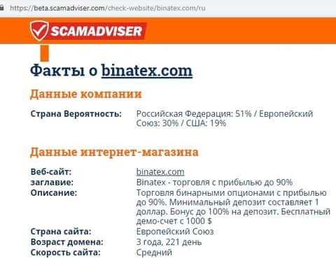 При попытке установления местоположения сервера проходимцев Бинатекс точное местоположение сервера определить не удалось. Базируется сервер на дешевых серверах компании Google и использует анонимный сервис для сокрытия личности владельца. Мнение сайта скамадвайзер ком по поводу жулья Binatex продемонстрировано на изображении ниже.