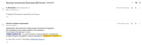Письмо пришло от человека, попавшегося на удочку к мошенникам BinoMax. Эти аферисты психологически обработали клиента и он неосознанно вложил 500 долларов. Шулер, который был ответственен за счет немного даже наторговал денег, чтобы показать, что тема работает. Жертва кидалова снова клюнул и вложил уже 150 долларов США. После, шулера решили, что больше с лоха нечего взять и не выходили на связь.