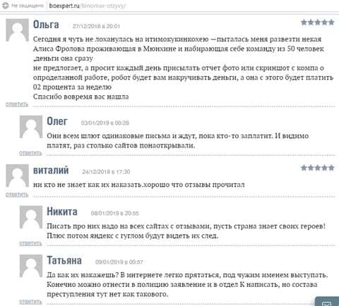 Несколько людей высказали мнение по поводу жуликов из кухни BinoMax, которым пришло письмо от некой Алисы Орловой, которая предлагает включиться в их мюнхенскую команду по торговле бинарными опционами. только для этого нужно приобрести их робота и вместе все начнут зарабатывать. Кто-то клюет на эту затею, а кто-то нет, у кого сколько мозгов хватает.